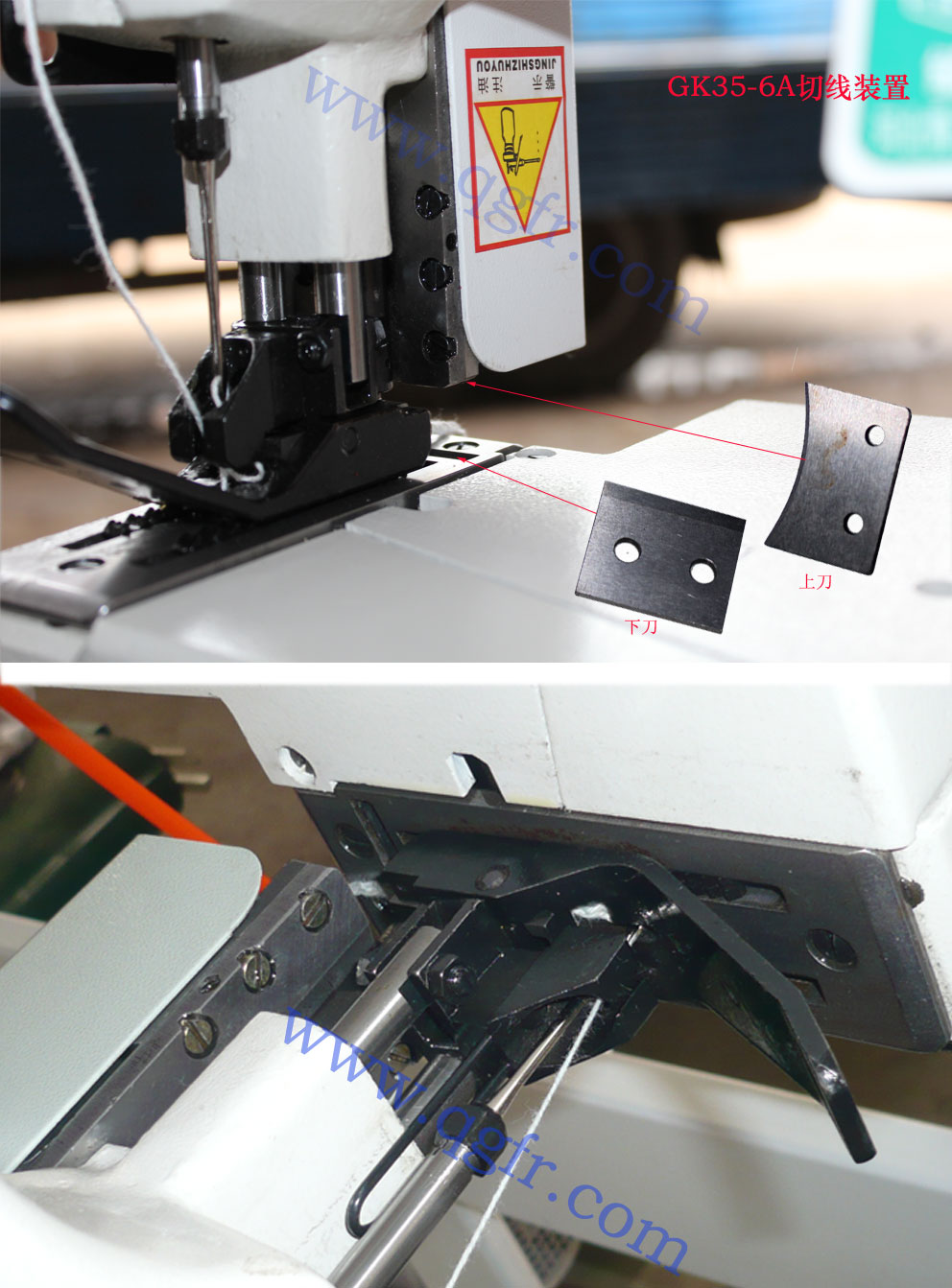 b.GK35-6A型全自動(dòng)縫包機(jī),采用切刀式結(jié)構(gòu),在氣缸推動(dòng)下,上刀與下刀配合完成切線動(dòng)作,切線更加可靠,而且能夠同時(shí)切斷皺紋紙等。
